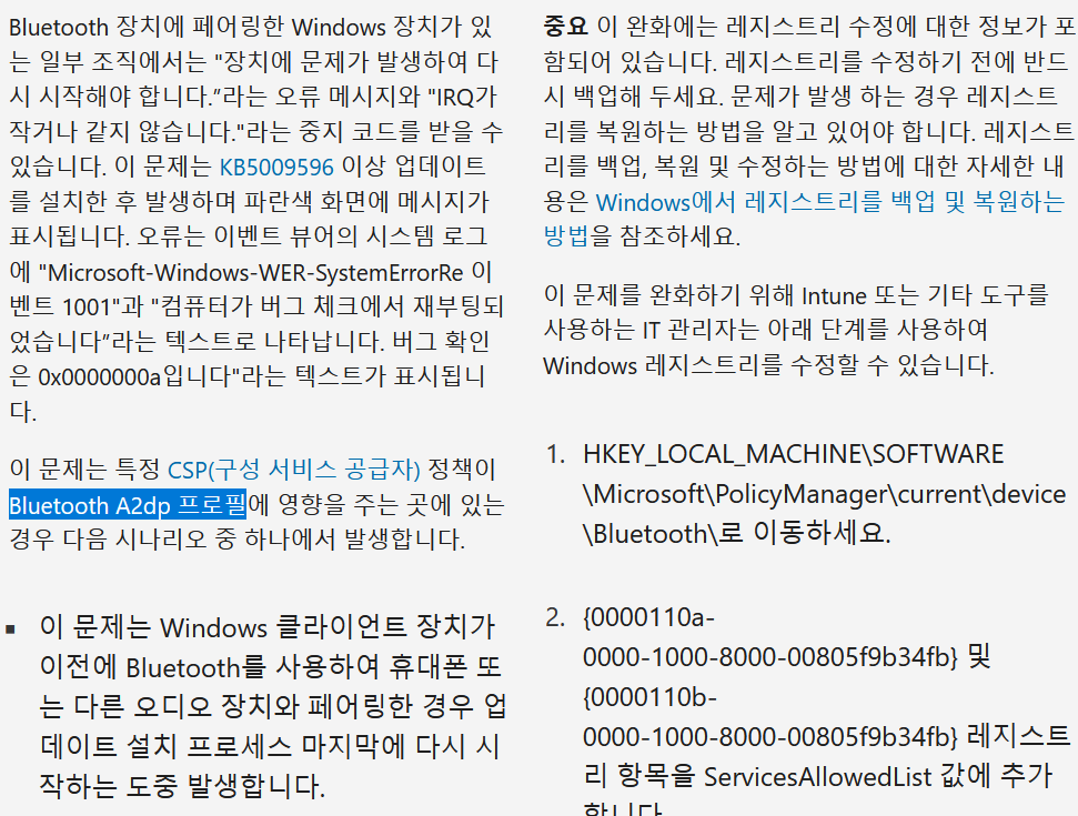 그렇게 이벤트 기록을 보니 BthA2dp.sys라는 파일이 문제라고 나온다.