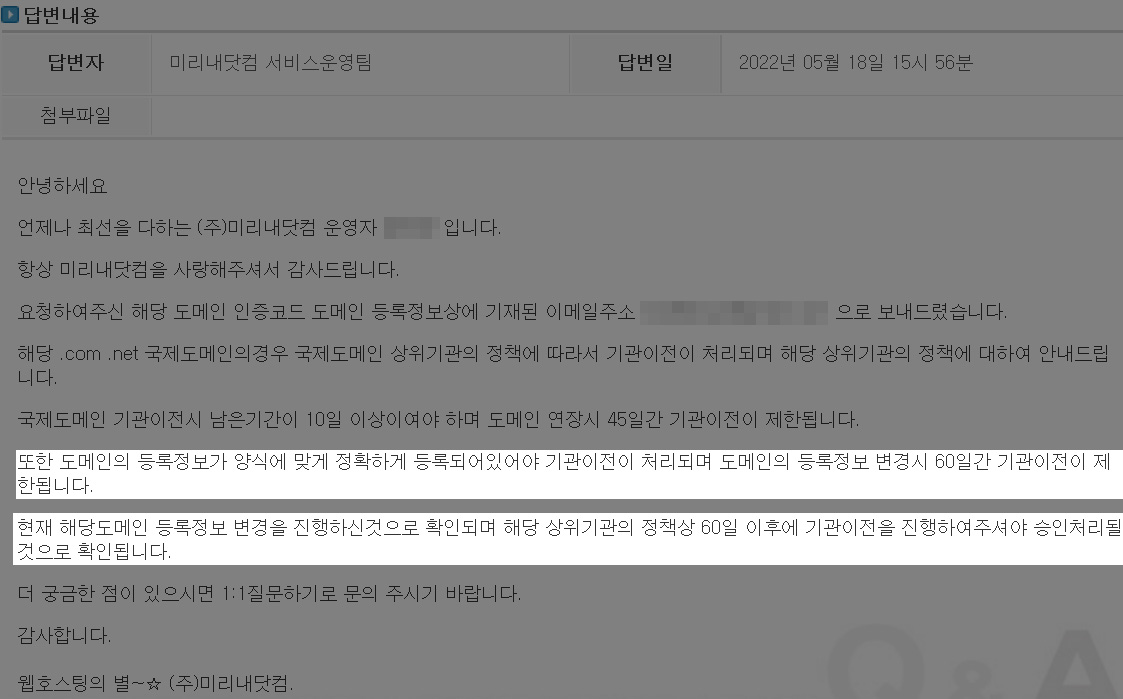 그래서 1:1 문의 글에 달린 답변을 열어봤지