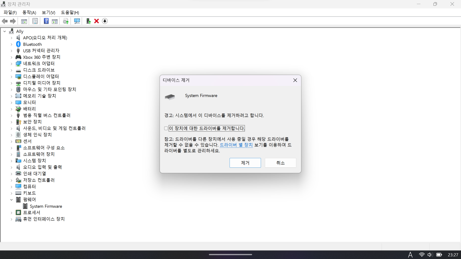 System Firmware에서 우클릭, 디바이스 제거를 누르면