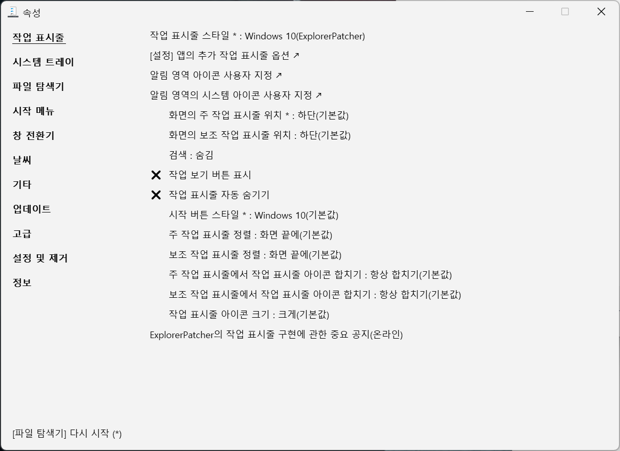 작업 표시줄 스타일을 Windows 10(ExplorerPatcher)로 바꿔주면
