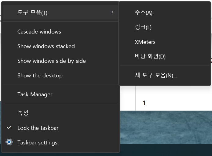 작업 표시줄 우클릭 메뉴에 도구 모음이 안 뜸.