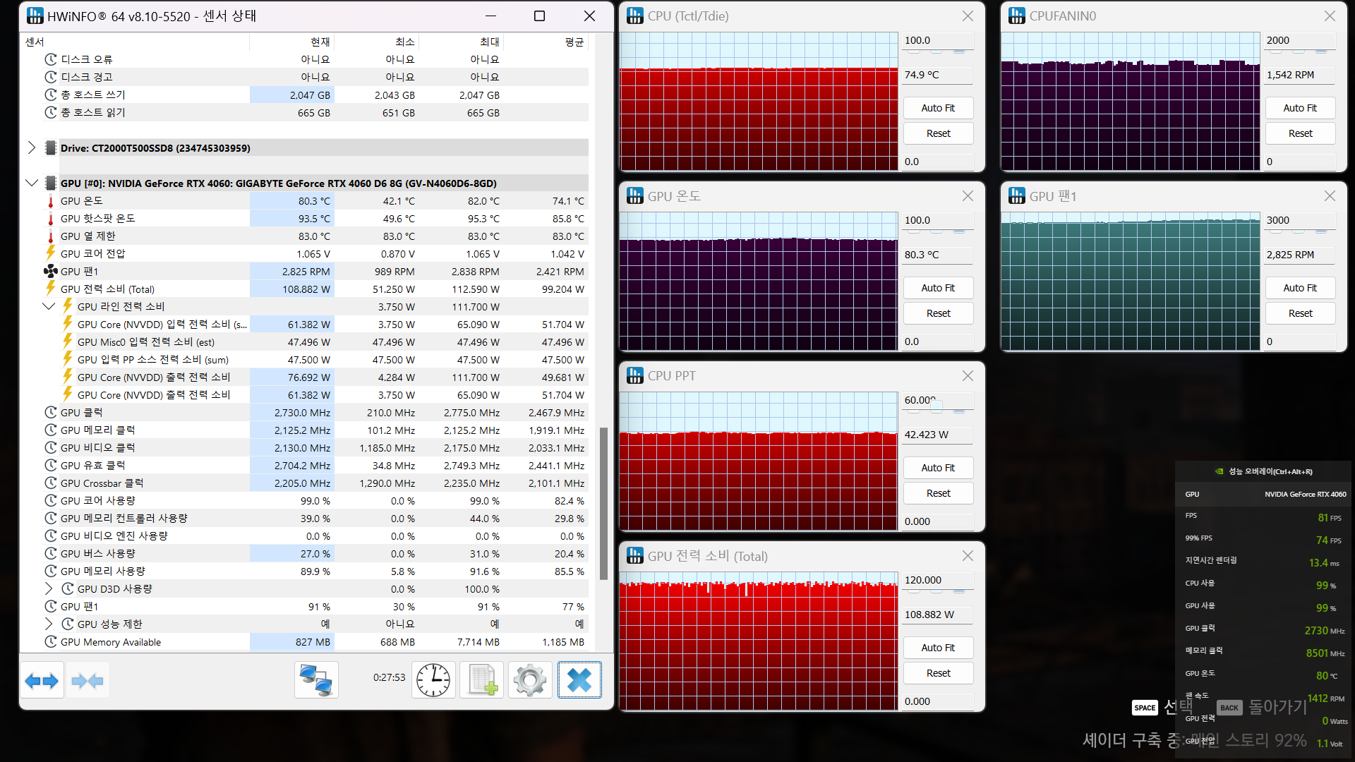 일단 GPU는 스펙대로 약 110W 정도 들어가고 있고