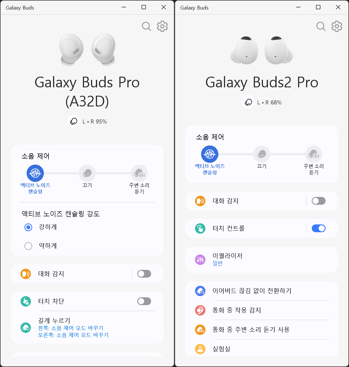 버즈 프로에서는 ANC, 주변 소리 듣기 강도 조절이 됐었는데
